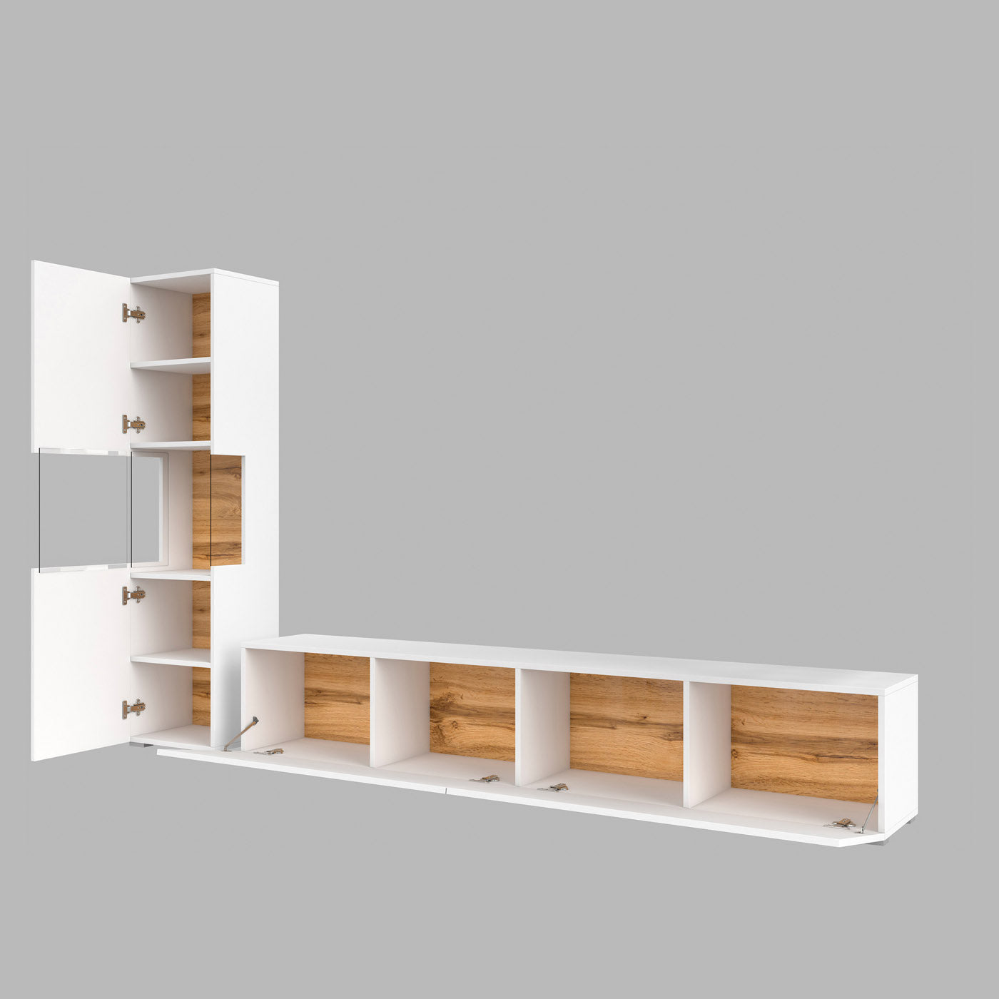 Šis stilīgais TV sienas skapītis piedāvā plašu modulāru elementu klāstu, kas ļauj pielāgot interjera izkārtojumu individuālām vajadzībām un vēlmēm.