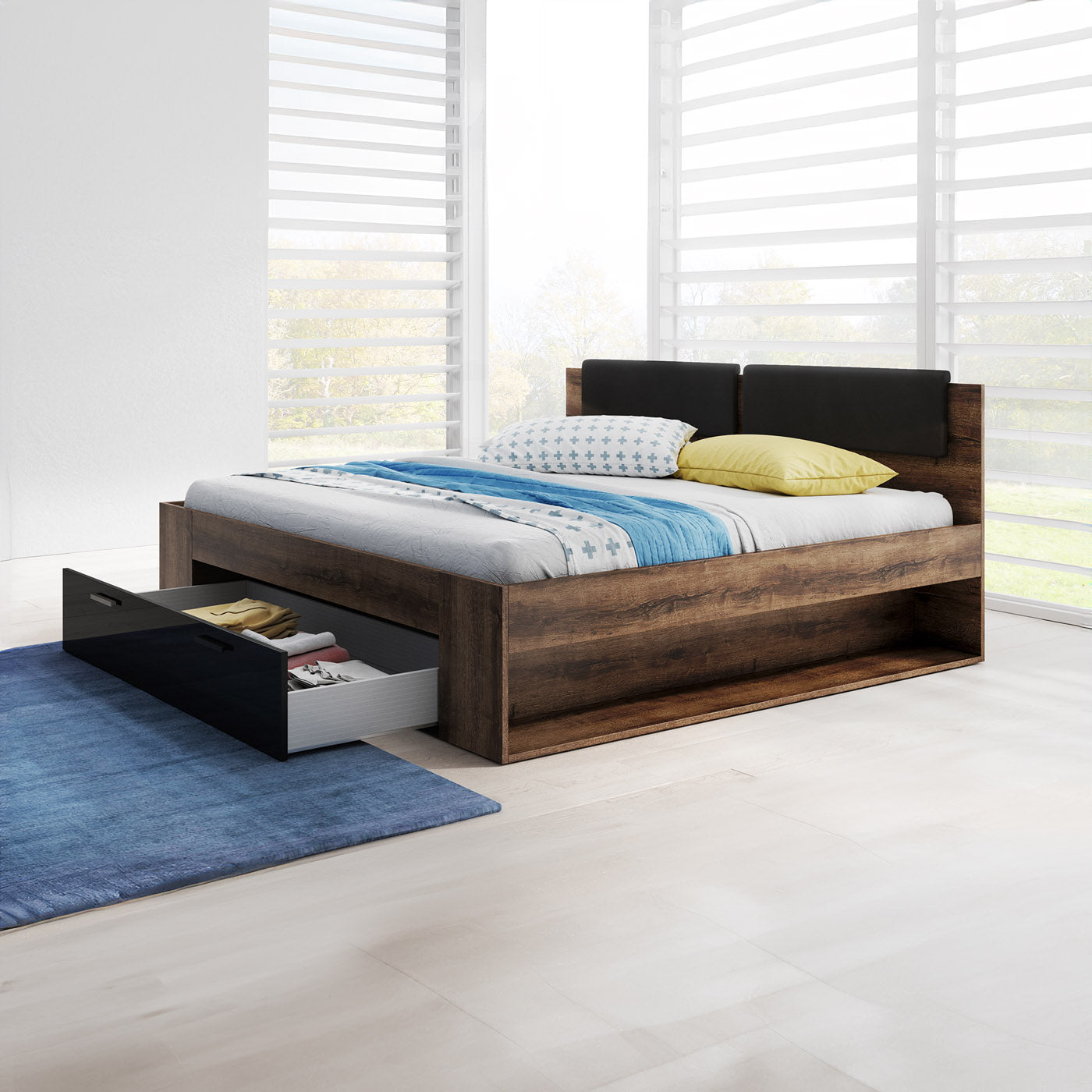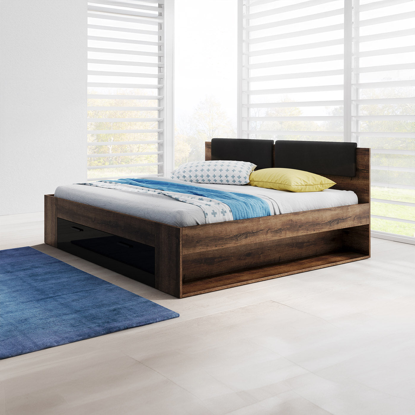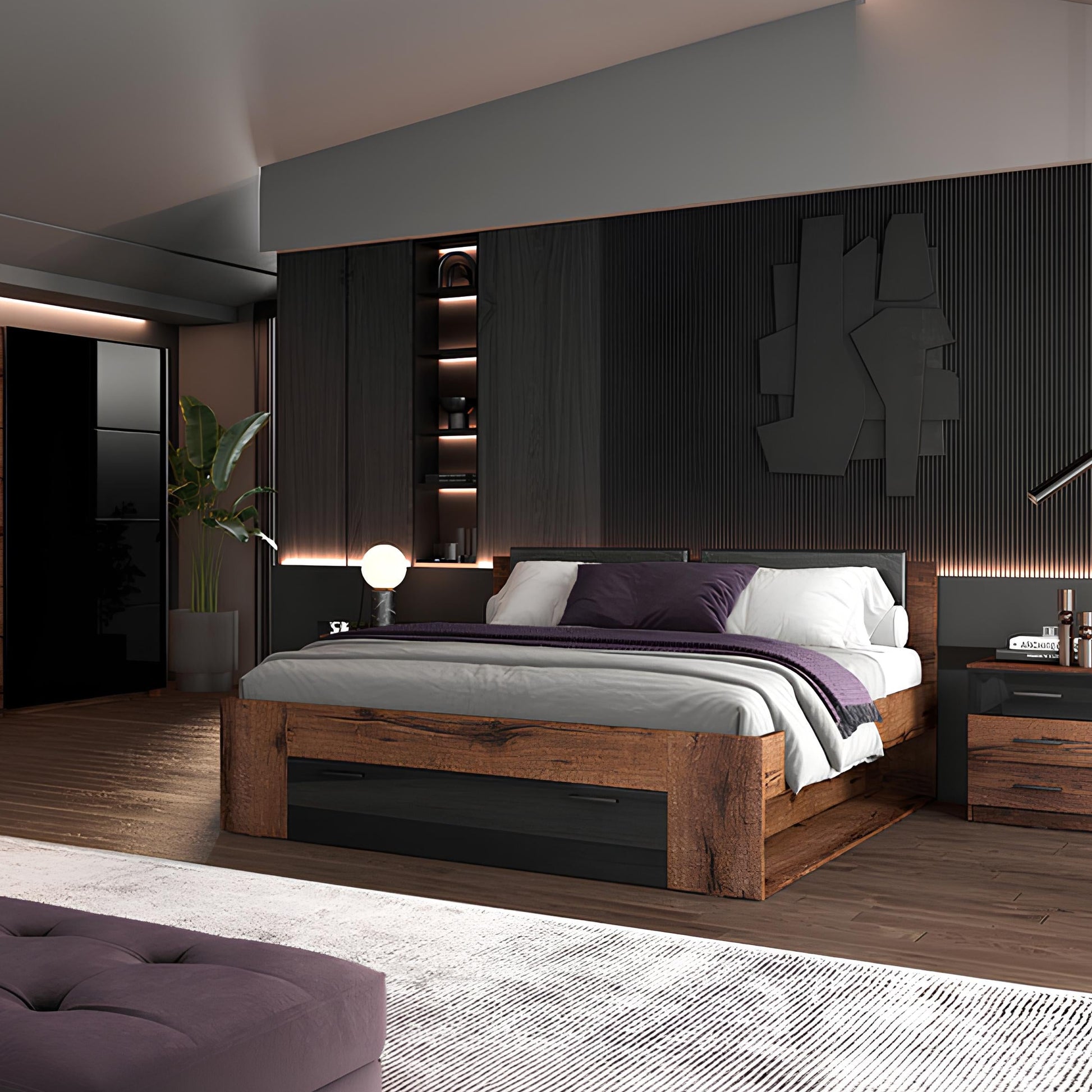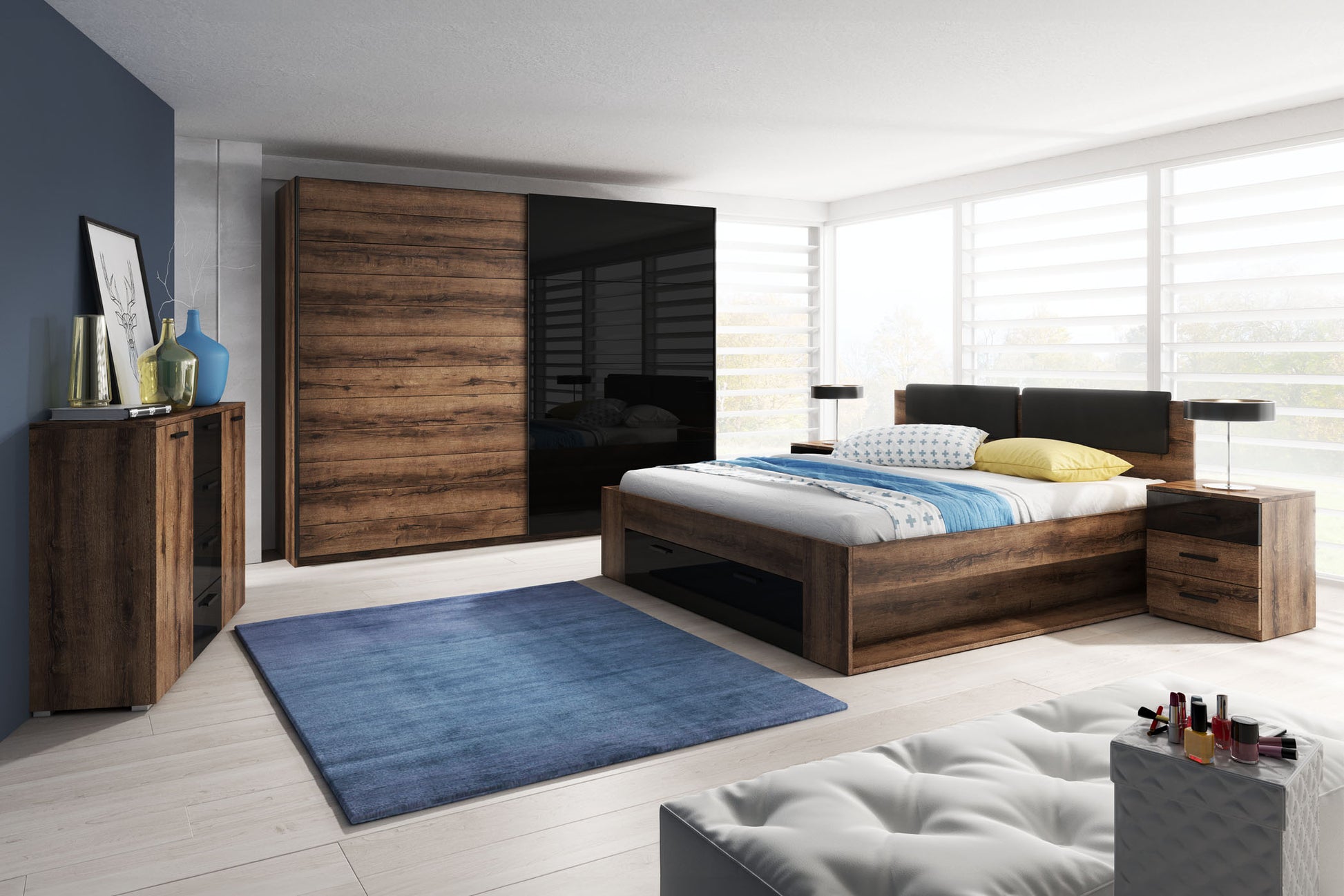 Mūsdienīgā guļamistaba tagad ir pieejama arī modernajā ozolkoka oglekļa dekorā ar dabīgu šķiedru rakstu neparastā grafīta krāsā.